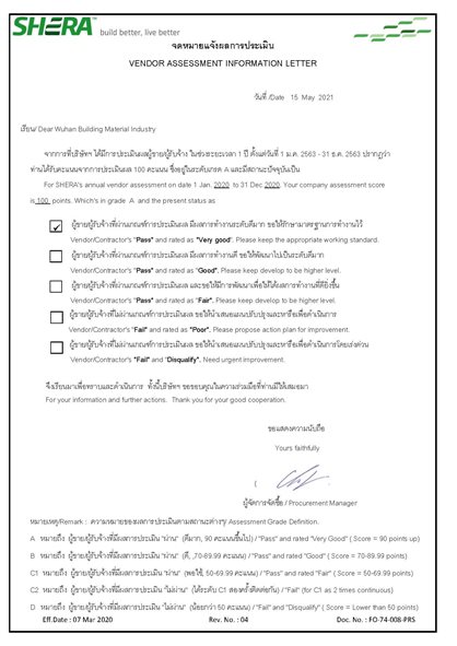 中材節(jié)能所屬武漢建材院榮獲泰國Shera集團2020年度供應商年度A級滿分供應商