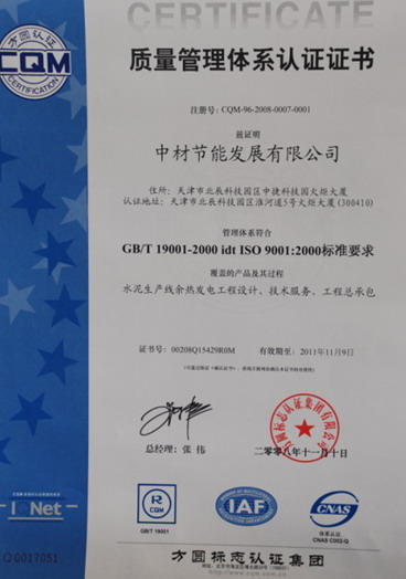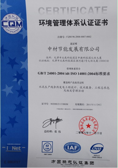 近日,中材節能順利通過方圓標志認證集團審核專家組對公司進行的三項體系(質量、環境及健康安全管理體系)認證審核,取得了ISO9001:2000質量管理體系、ISO14001:2004環境管理體系及GB/T28001-2001職業健康安全管理體系認證證書。