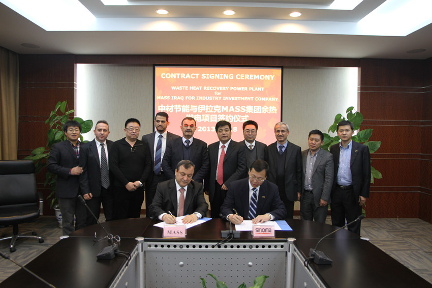 2013年12月18日,中材節能與伊拉克MASS工業投資集團(MASS Iraq for Industry Investment Company)在昆山成功簽署了伊拉克首個水泥窯余熱發電項目總承包合同。這是中材節能繼在承接沙特、阿聯酋水泥窯余熱發電總承包工程之后,在中東市場上獲得的又一重要訂單。該項目是利用伊拉克MASS集團旗下的SCP水泥廠3條日產5000噸水泥生產線建設的余熱發電項目,該項目總裝機規模為25MW。